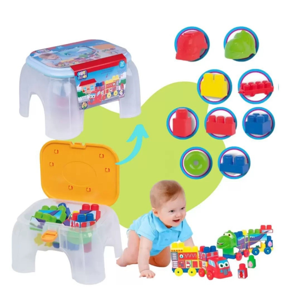 Um brinquedo super legal. Quando fechado ele vira um banquinho para os baixinhos sentar, pode ser levado para onde quiser, muito leve. No próprio banquinho pode ser guardada as peças do brinquedo. Todas as peças possuem encaixes. Vem com adesivos para os pequenos decorar o brinquedo.
